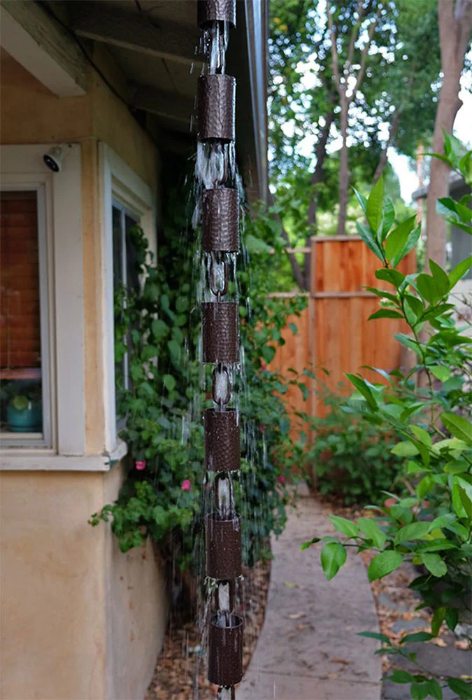 This chain is a beautiful modern design that has cylinder shaped cups with links connecting each cup. The patented design provides a very strong connection that keeps the cups straight while maintaining length adjustability. Available in pure, unfinished hand hammered copper, 316L marine-grade stainless steel, or hand-hammered aluminum with a Bronze or Black powder-coat finish.
