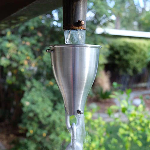 Are the outlet dimensions from the gutter larger than your link rain chain? Does water miss the chain completely? The Link Chain Reducer - is a specially designed, large rain chain cup with a bolt across the bottom. This will accept most link design chains and channel more of the water from the outlet onto the chain. The top lip is folded for extra strength and looks great. Link Style Rain Chains tend to splash more than cup designs, this accessory will help your link style rain chain work the best that it can. (The rain chain shown with the Link Chain Reducer is not included.)