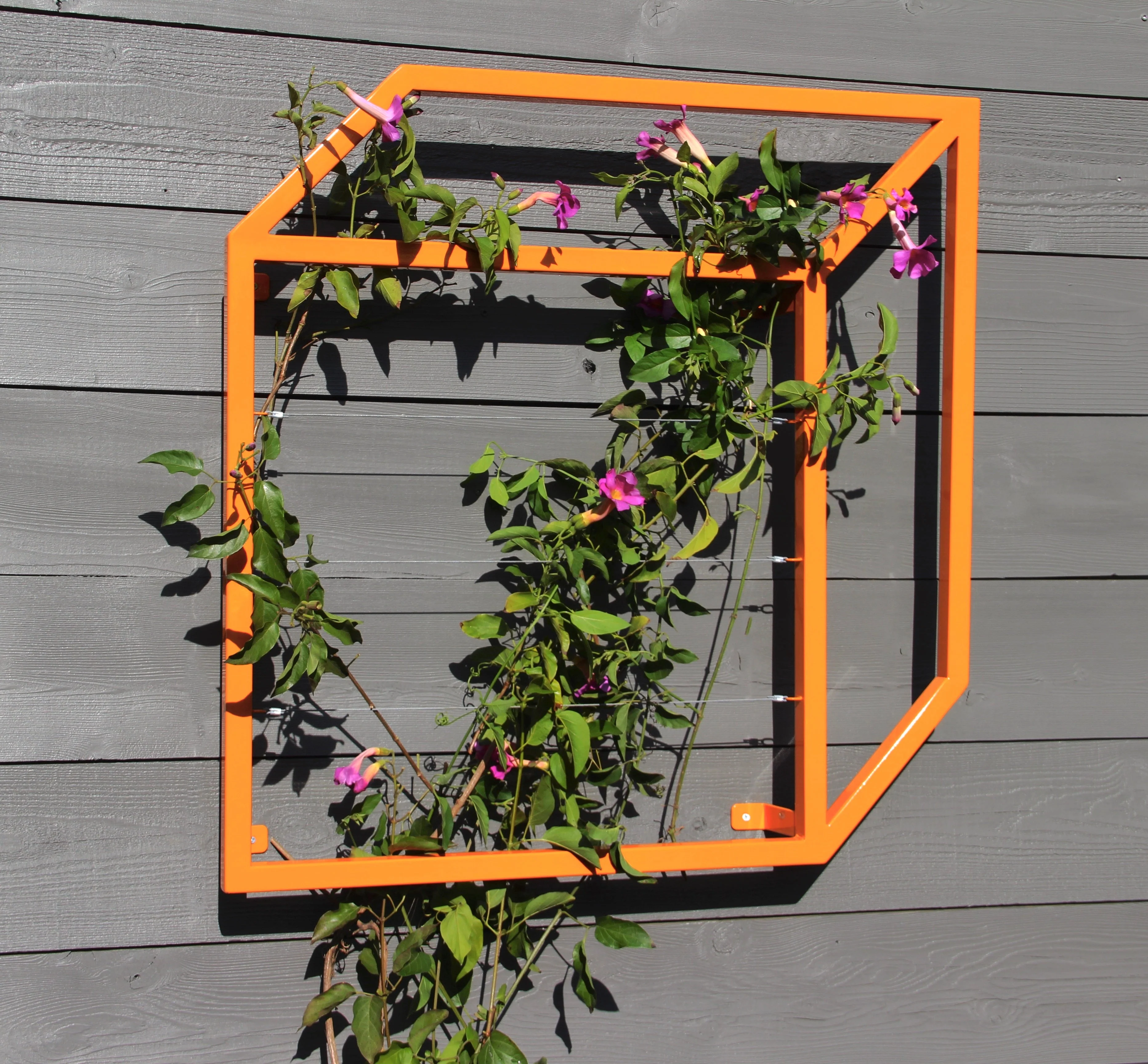 Inspired by vertical gardens and cubism. The Pablo Wall Trellis is a nod to history's most renowned cubist artist, Pablo Picasso. The flat wall trellis gives the illusion of a 3-D cube floating off the wall, throwing extraordinary shadows. With vines woven throughout it becomes a living wall sculpture. With or without plants, the Pablo Wall Trellis is a trompe-l'oeil functional sculpture on the garden wall.