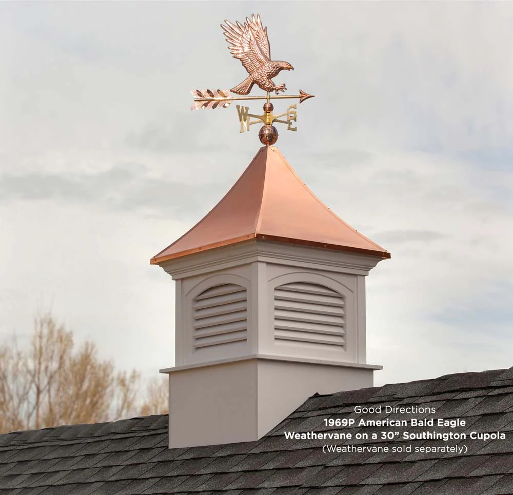 Since 1982, Good Directions cupolas have been the perfect complement to your home, garage, shed, barn, gazebo, pool house, carriage house, horse barn, or pavilion. Our expertly crafted, made to order, Southington louvered cupola features roof molding and reinforced interior supports for added strength. It's made to order in the USA from durable, maintenance free Royal Brand PVC vinyl, constructed with precision using a CNC Router for accuracy and a lifetime of enjoyment. The Southington Cupola features a 16 ounce, 24 gauge copper, pagoda style roof that adds an architectural element of beauty and lasting value to your home.