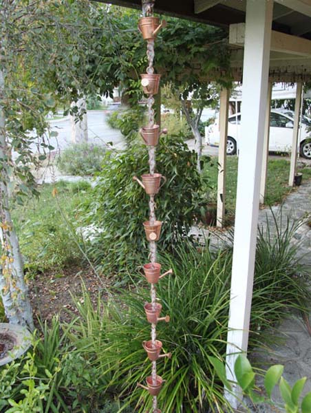 What better way to catch rain water than with watering cans! Beautifully detailed from the handle to the spout, this functional rain chain is hand made out of pure copper. The Watering Can Cups are separated by five small copper rings and simply hook together for easy assembly and adjustment. No tools required!